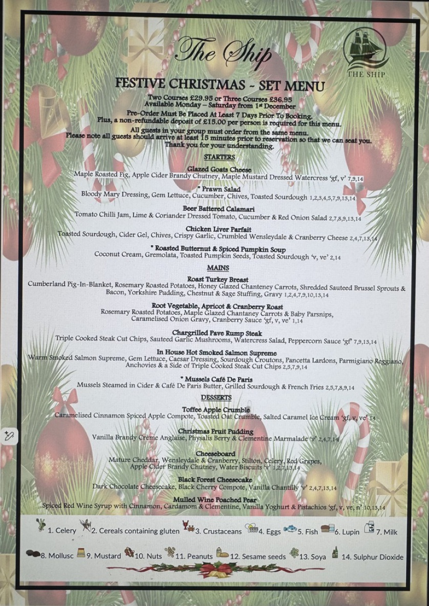 Festive Pre-Christmas Set Menu will require a pre-order(see below) available from 1st December and offers a set price for a 2 or 3 course meal.